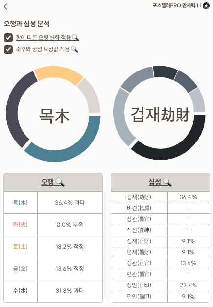 - 오행 분포 그래프 → 어떤 기운이 많은지 시각적으로 표시