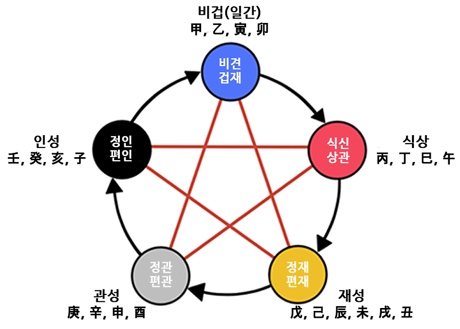 십성은 음양오행의 상생상극 관계를 기반으로 나를 중심(일간)으로 볼 때의 관계와 의미를 부여한 것입니다.