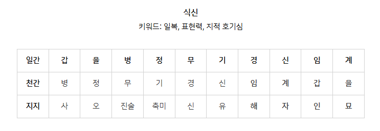 | 식신 | 지적 호기심 | 일에 성실하고 조용한 표현력 |