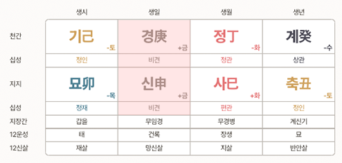 | 일간 | 갑 | 을 | 병 | 정 | 무 | 기 | 경 | 신 | 임 | 계 |